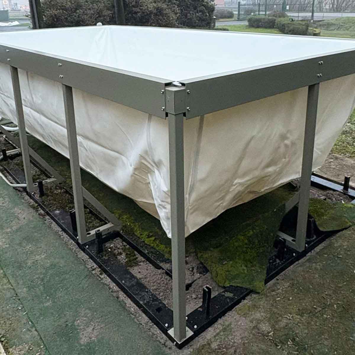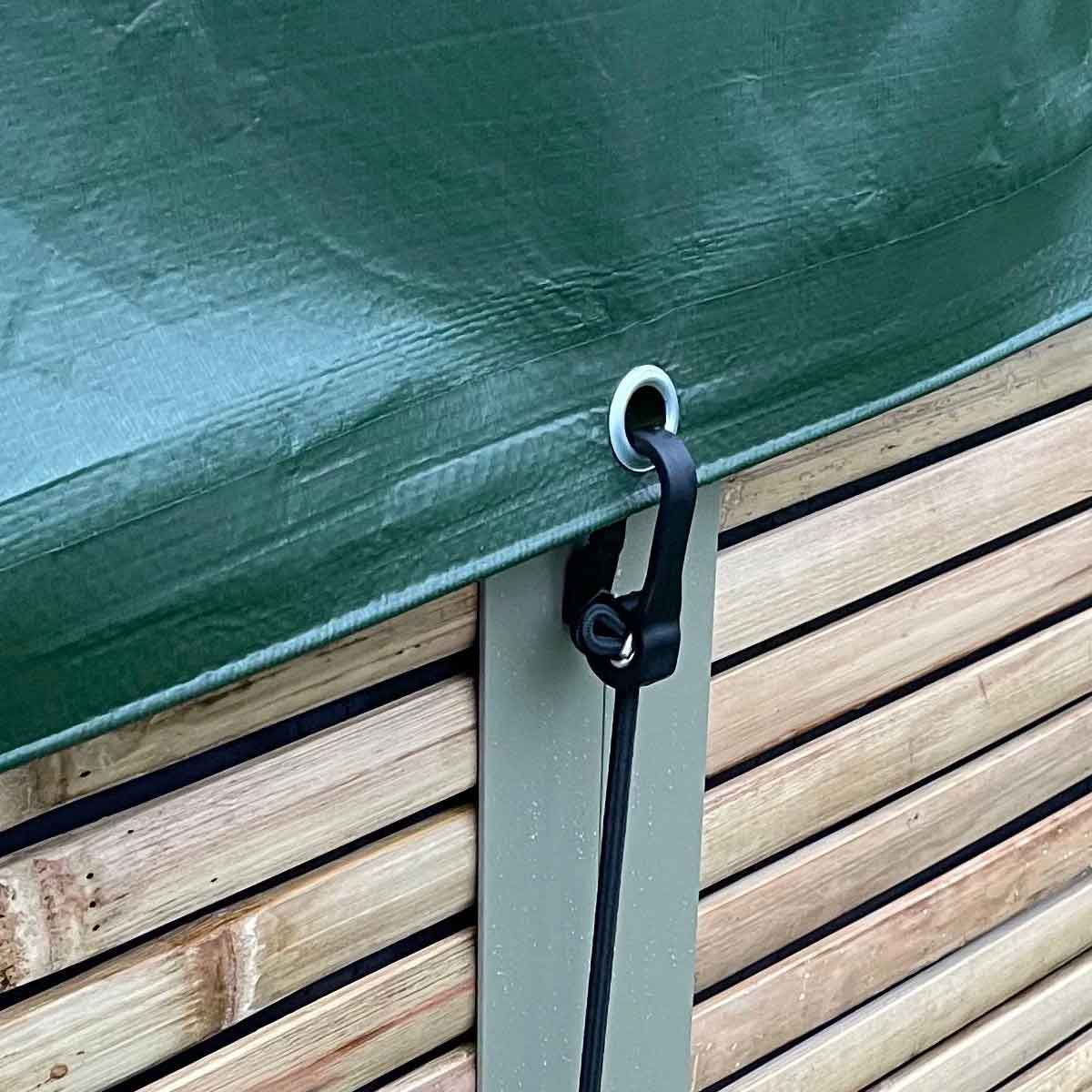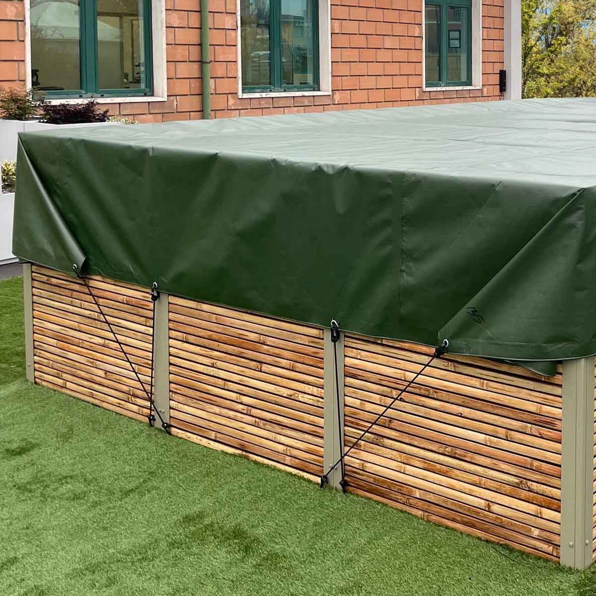 Il telo di copertura invernale (di colore verde/nero) con tiranti elastici permette la chiusura ermetica della piscina per tutti i mesi in cui non viene utilizzata.