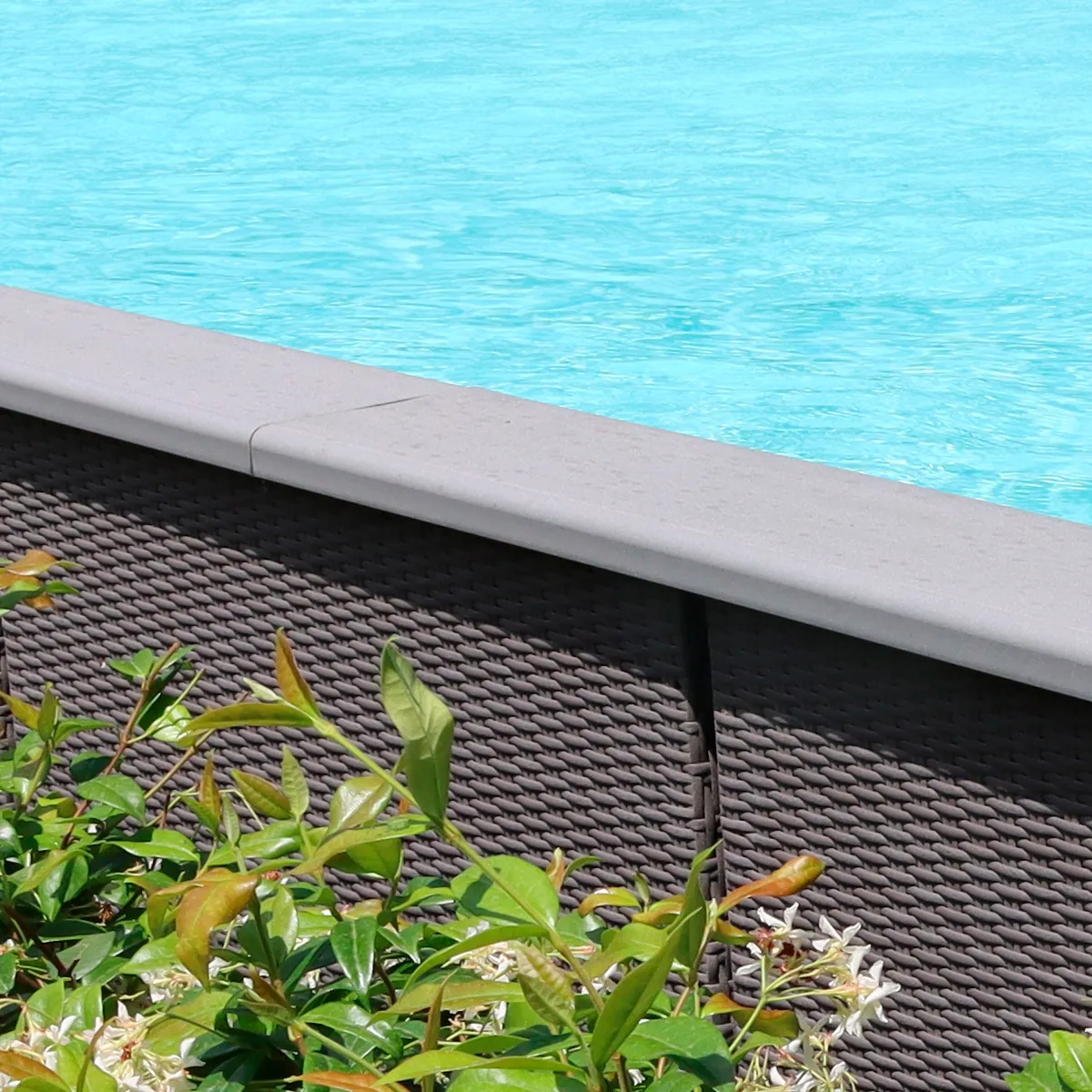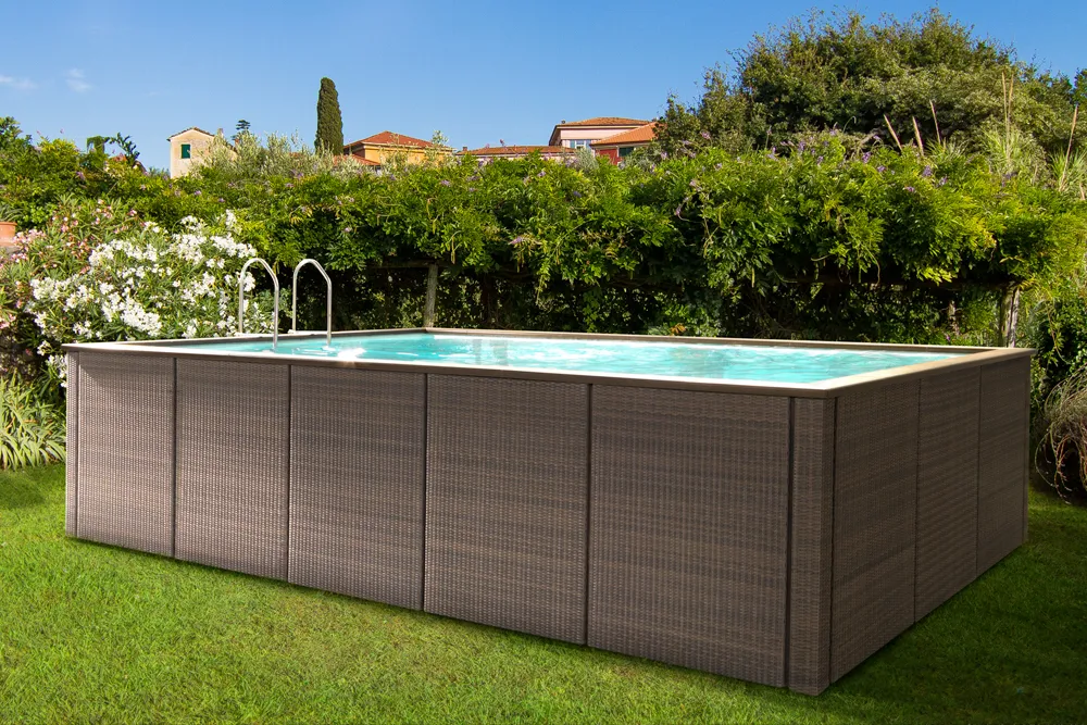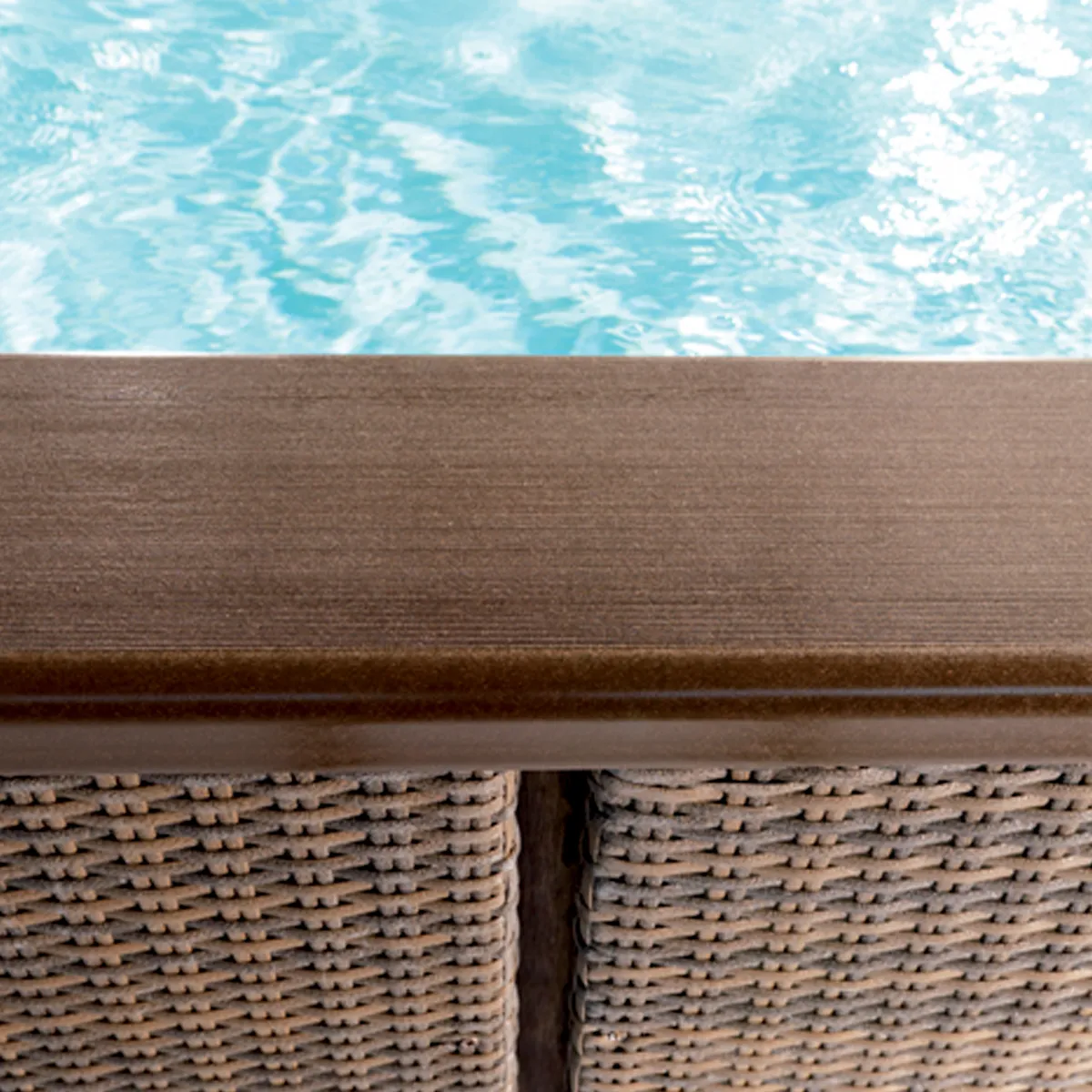 - EXTERIOR External facing in hand-woven synthetic fibre over a painted aluminium frame and pool border in eco-wood