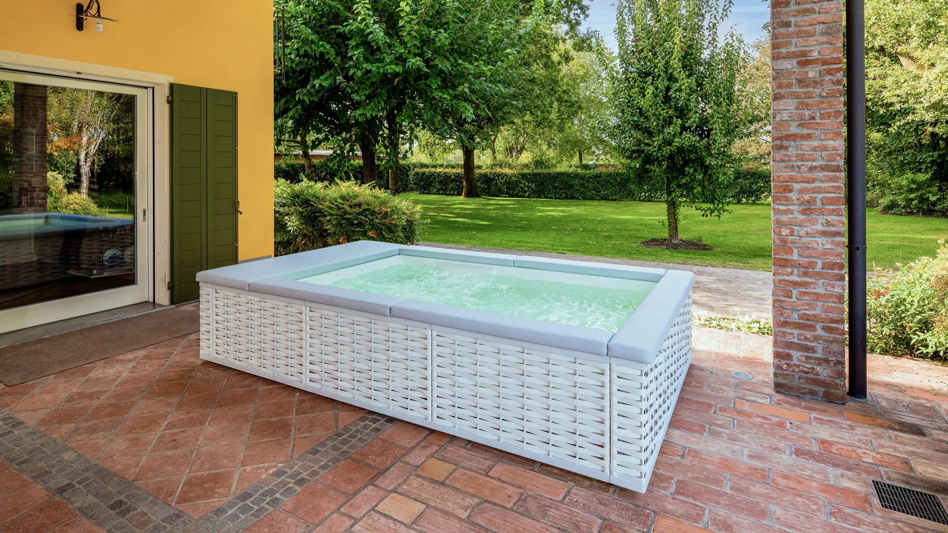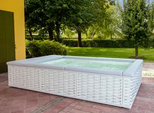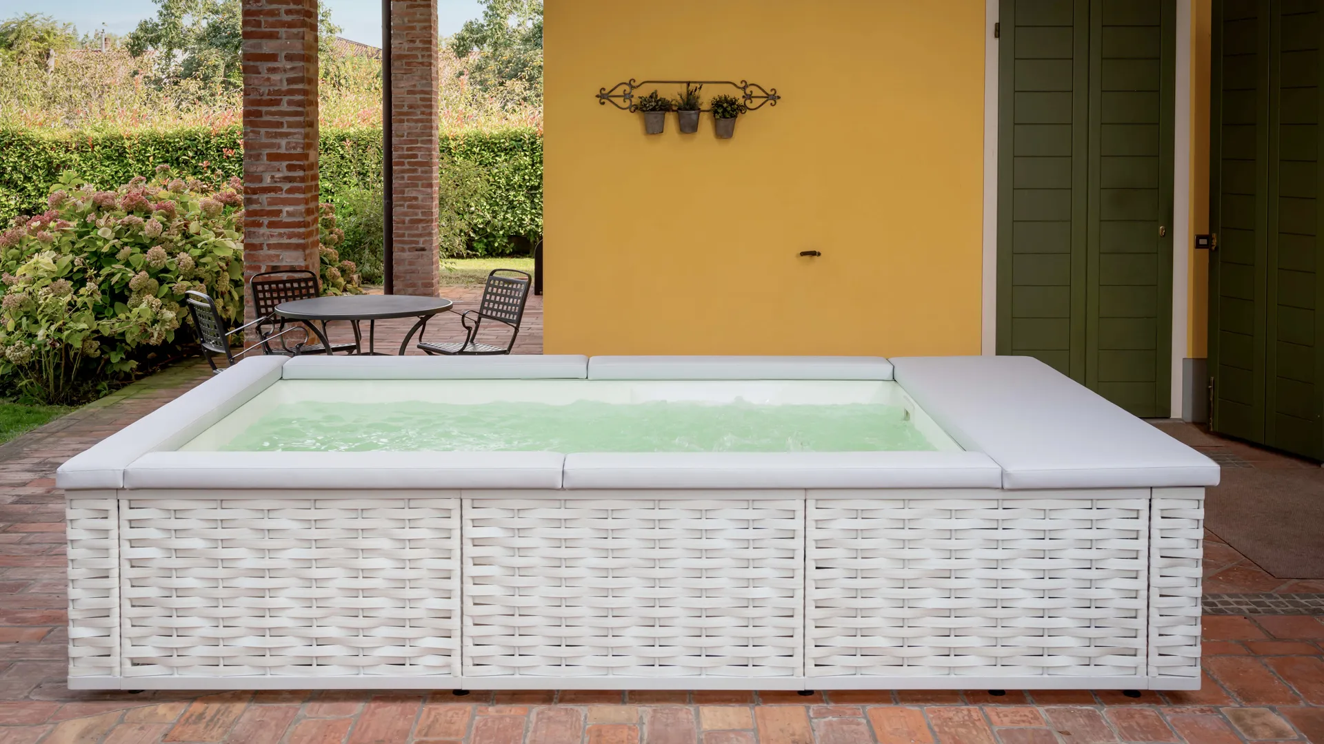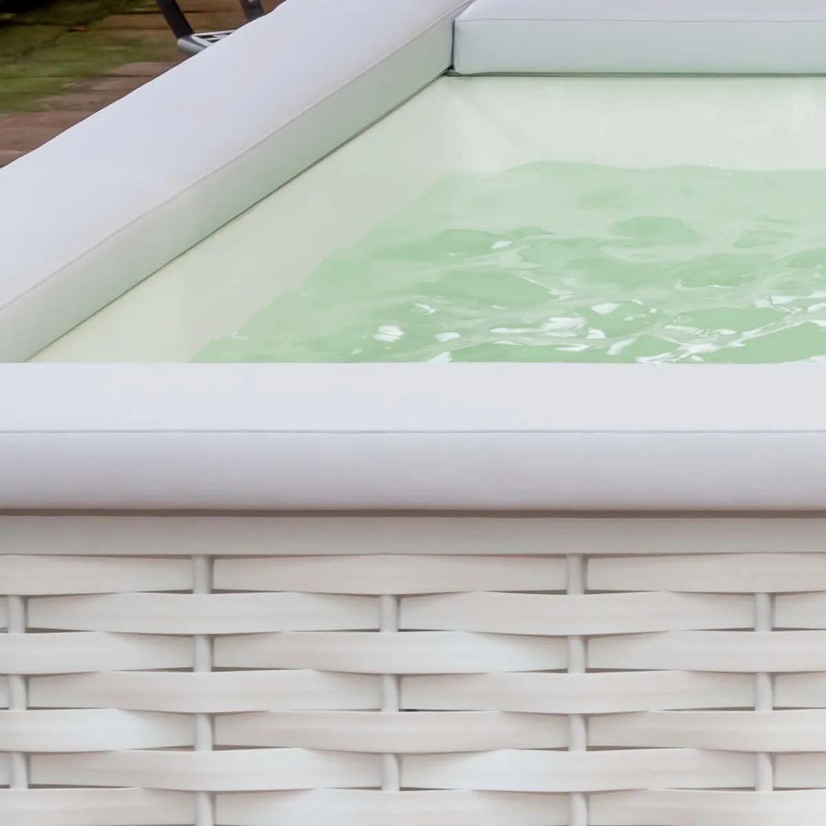 De inspiración náutica son los cojines que rodean todo el perímetro de MUSA añadiendo placer tanto al uso en el agua como alrededor de la minipiscina, convirtiéndola en un lugar de convivencia y compartición.